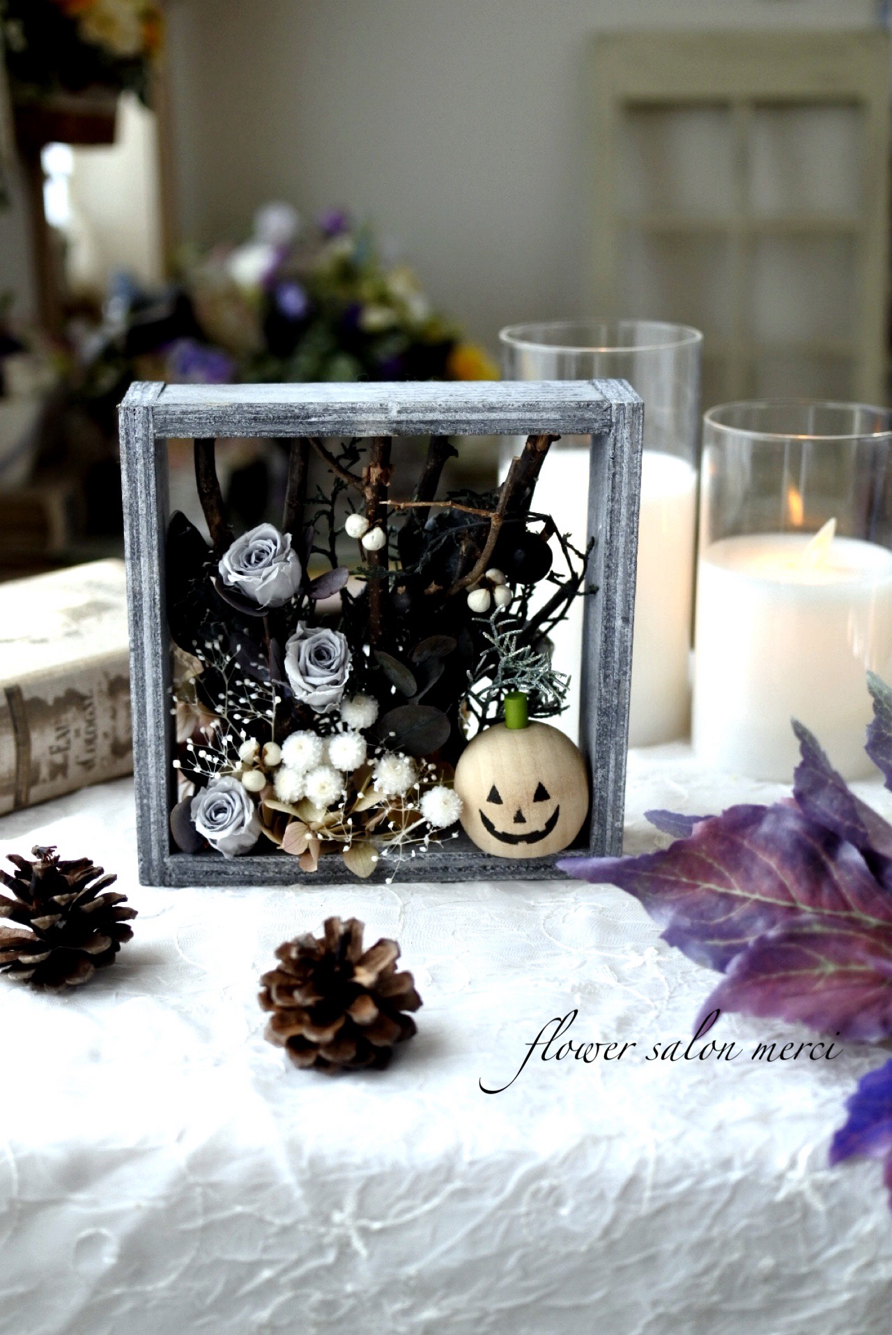 シャビーなグレーのBOXにハロウィンの森をイメージしたアレンジです。